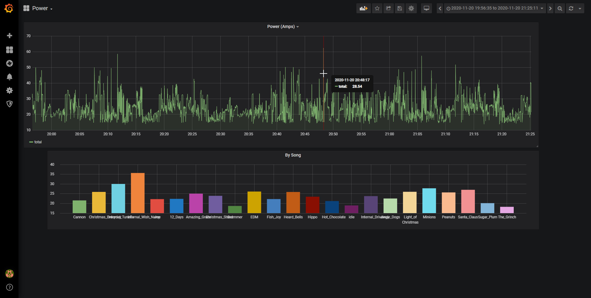 In 2020, we added a new P10 panel display to provide information to viewers about our display. Measuring 12ft wide and 2ft tall, the sign displays information of interest include the radio station we broadcast on, the near real-time power power consumption for the display, the phone number for interacting with the display, and periodically the total amount of power the display has consumed for the season.