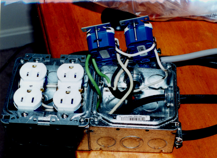 Note: It would have been nice if 10 wires could have been easily brought in so that a common ground wire could have been used to ground the entire box. This can be accomplished by having the 110V pig tail that brings the AC current from your house, go directly into the boxes that hold the outlets rather than into the box that holds the relays. If wired this way, the ground and NEUTRAL wires from the pig tail can be connect to one of the outlets and then the hot (black) wire could be sent up to the relay box though on of the nine wires that connect the outlets to the relay box. In that case, 8 of the 9 wires could carry the individual hot circuits down to the outlets, and the other wire would care the common hot circuit up to the relay box. Unfortunately, I build my demo box before thinking of this solution. |