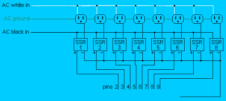 The Control WiresThe last piece of the puzzle is adding the control wires for the parallel port. All I did is take a printer cable, and cut off the end that goes to the printer. Pins 2-9 on the parallel port cable should go to the individual SSRs (HOT side)and the ground wire (usually back with white stripe) should connect to the NEUTRAL side of the SSRs. |