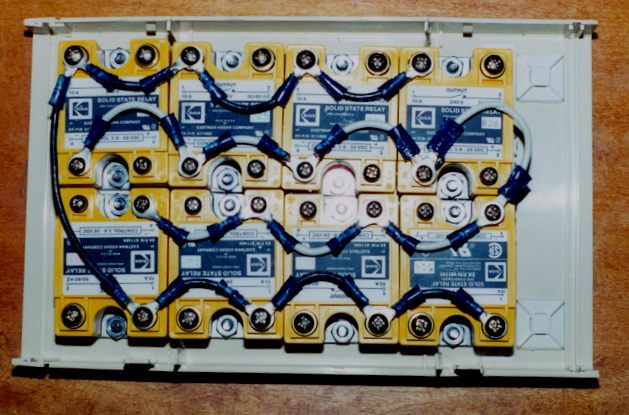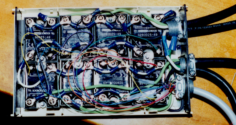 The Wired Relay BoxWhen wiring the relays into the box, the NEUTRAL terminals of the low voltage side can all be wired together (white wire). (I really should have used a much smaller wire since only 5vdc is being carried across, but I didn't have any handy. Surprisingly, the voltage drop by using 14 gauge wire is hardly noticeable.)The incoming terminals of 110V AC sides can all be wired together too (black wire). This way 110V is available at each SSR, ready to be switch on. If you want to include indicator lights in your boxes, make sure you get 120V indicators and connect them across the 120V AC side of your SSR. It is better to do it this way rather than using a low volage LED because (1) the indicator won't light if the SSR burns out, and (2) you aren't pulling amps from the computer's power supply to power to indicators. |
