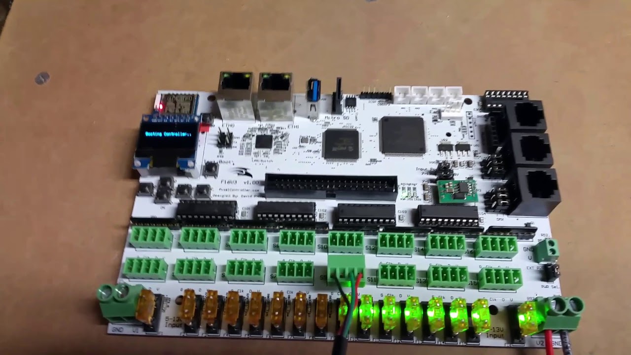 Although there are a number of Pixel Controllers] on the market, we currently use Falcon Boards from Kulp Lights for any new construction. We still have 3 Falcon F16v3 and a few AlphaPix 4 controllers. All types of controllers take DMX over IP Ethernet (E1.31) and convert the data to the WS2811 serial protocol that the pixels understand. These controllers sit outside, near the pixels in waterproof enclosures along with power supplies that convert 120V to either 5V or 12V for the pixels. The FPP-based controllers allow the sequence to be loaded into the controller, reducing network bandwidth during the show.